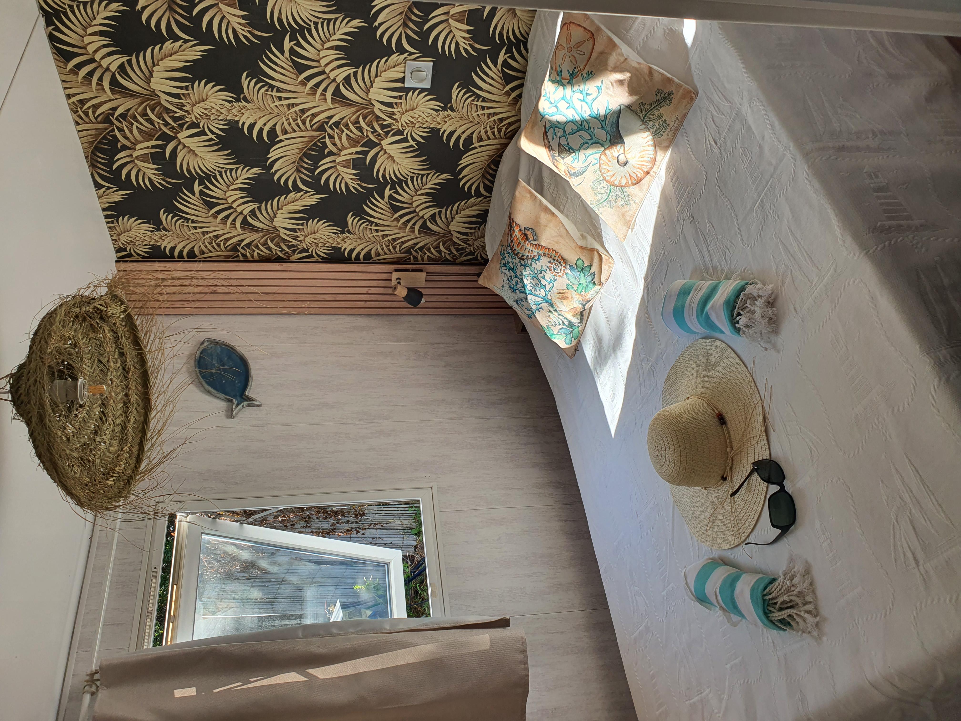 Location d’un confortable « COTTAGE MER « tout confort et refait entièrement à neuf, comprenant 1 chambre avec literie confortable neuve 140 x 190 cm (matelas à mémoire de forme épais) avec un placard penderie, grande porte coulissante de la chambre ouvrant sur séjour, séjour avec canapé confortable neuf et convertible 130 x 190, TV écran plat, internet, climatisation réversible neuve, belle cuisine ouverte avec plaque de cuisson 2 feux et hotte, four micro-onde, réfrigérateur avec partie congélateur, très bien équipée, 1 salle d’eau avec douche à jets et lavabo, 1 WC séparé. Décoration soignée.
