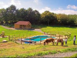 5 chalets bois, 3 clévacances, 3 étoiles, avec piscine chauffée à la campagne, 1 à 6 pers, tout confort, avec terrasse panoramique couverte. Très jolie vue dégagée sur collines verdoyantes et boisées.