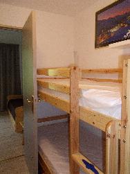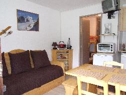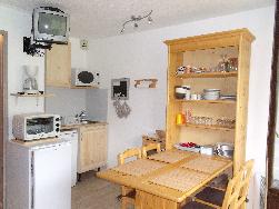 Studio avec balcon orienté Sud est composé d'une table et de 4 chaises, Coin cabine avec 2 lits superposés séparé par une porte de la pièce principale, salle de bain, wc, pièce principale avec canapé lit 2 personnes, coin cuisine avec plaques vitrocéramique, appareil à raclette, à fondue, pierrade, autocuiseur, grille pain, cafetière, micro onde, four, lave vaisselle etc.