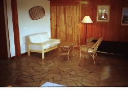 Séjour : coin salon, coin repas, cuisine équipée (4 plaques élec., four, micro-ondes, frigo), sortie sur la terrasse; chambre : l lit 2 pers., lit bébé (pliant),