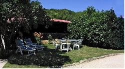 Le jardin avec barbecue et bains de soleil pour le bronzage ou les repos à l’ombre de la verdure.