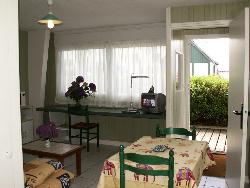 Le séjour, exposé sud, est composé d’un canapé convertible de 2 couchages, d’une télévision, d’une table de cuisine et de 4 chaises.