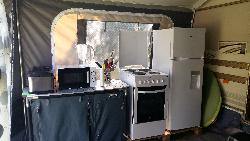 Caravane avec une chambre lit pour 2 personnes + banquette table aménageable en lit pour 2 personnes