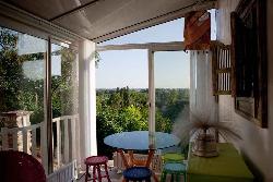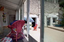 Véranda : canapé 2 places, 2 fauteuils, table basse, bibliothèque, table de repas , 4 tabourets.