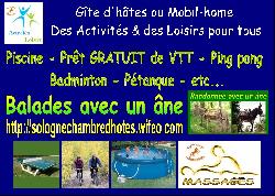 Piscine, Prêt gratuit de VTT, Balade avec un âne, Ping-pong, Speed-ball, Pétanque, Badminton, Golf miniature sur herbe, Jeux et jouets pour enfants, etc.…