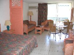 Studio climatisé de 40 m2, au 2e étage avec terrasse;Salle de bain et kitchenette toute équipée(plaques cuisson,frigo,micro-onde,cafetière,grille pain...) ; grande pièce avec coin chambre(lit king size) et coin salon-salle (canapé-lit 1 personne, fauteuil,TV,table ronde 4 personnes...)