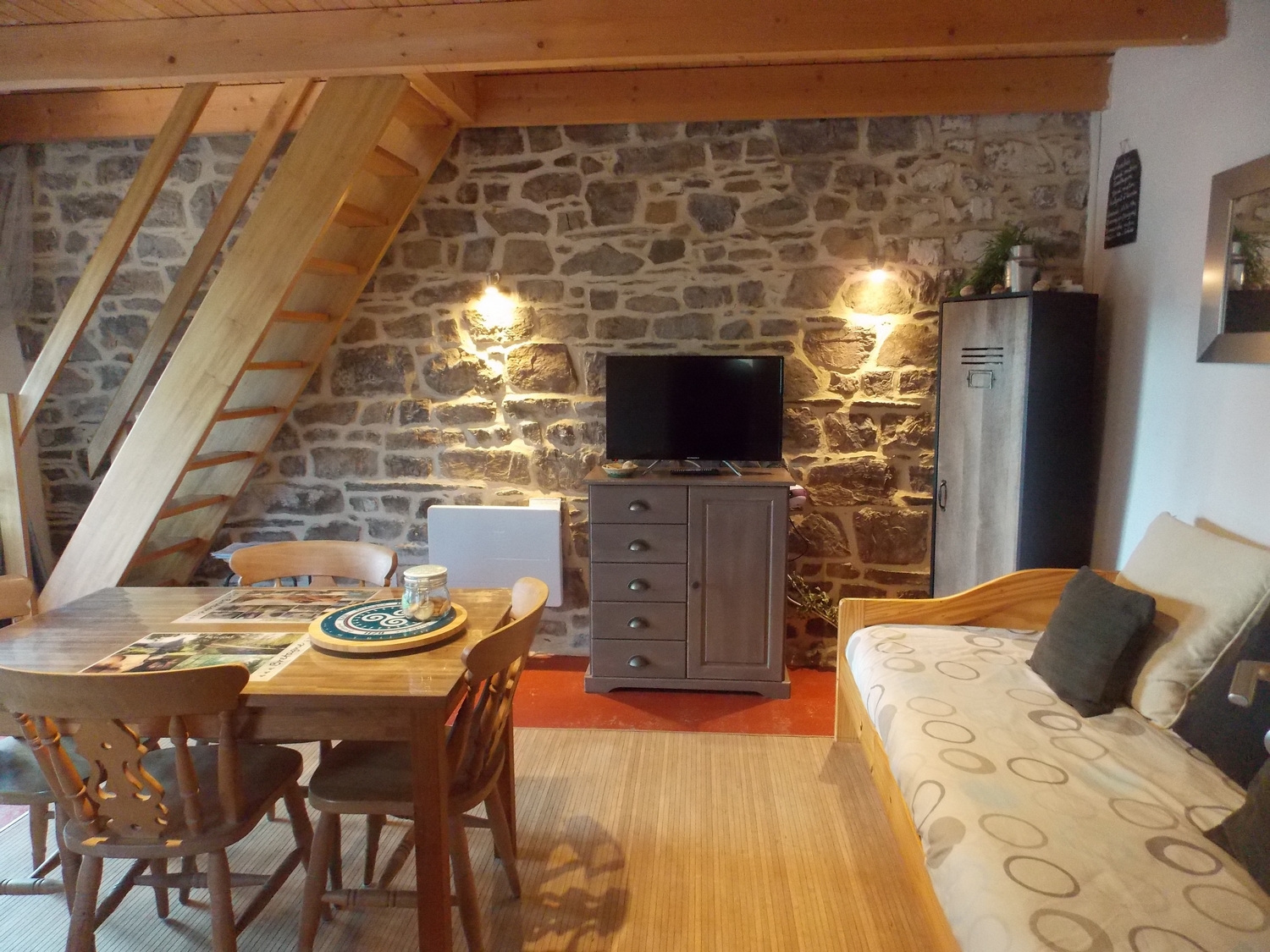 Au rez-de-chaussée : une pièce de vie avec coin cuisine et le nécessaire pour cuisiner (gazinière avec four à gaz, frigo, micro-ondes, grille-pain, cafetière et bouilloire électriques), un fauteuil relax, un lit-banquette, tv,