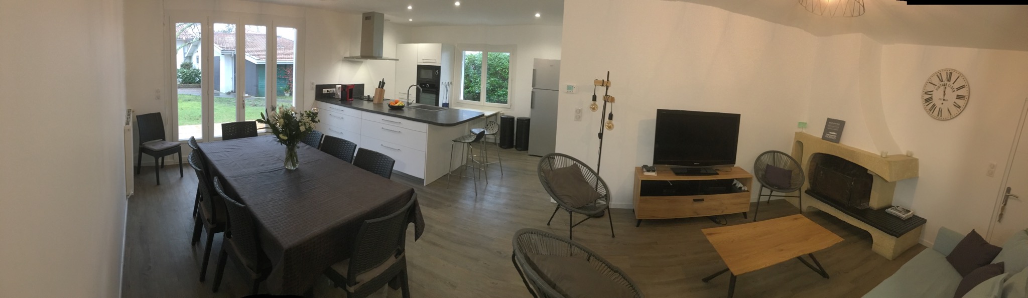 Une grande pièce à vivre avec une cuisine ouverte (lave-vaisselle, four, four micro-onde, réfrigérateur, cafetière Senseo et cafetière à filtre, grille-pain, bouilloire etc.…).