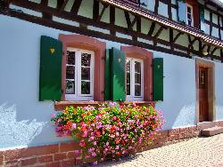 Gîte aménagé au r.d.c. d'une maison indépendante à colombage située dans la cour du propriétaire dans le village, proche de la forêt. 2 chambres (2 x 2 lits 1p), séjour (convertible 2 p, prise TV), cuisine (+ Lave linge), s.d.b avec wc, baignoire et douche. Chauffage central en supplément Lits faits à l'arrivée. Lit enfant. Parking, espace vert, mobilier de jardin, barbecue, bac à sable. Portes peintes en polychrome (style Alsace). Piste cyclable trans-frontalière.