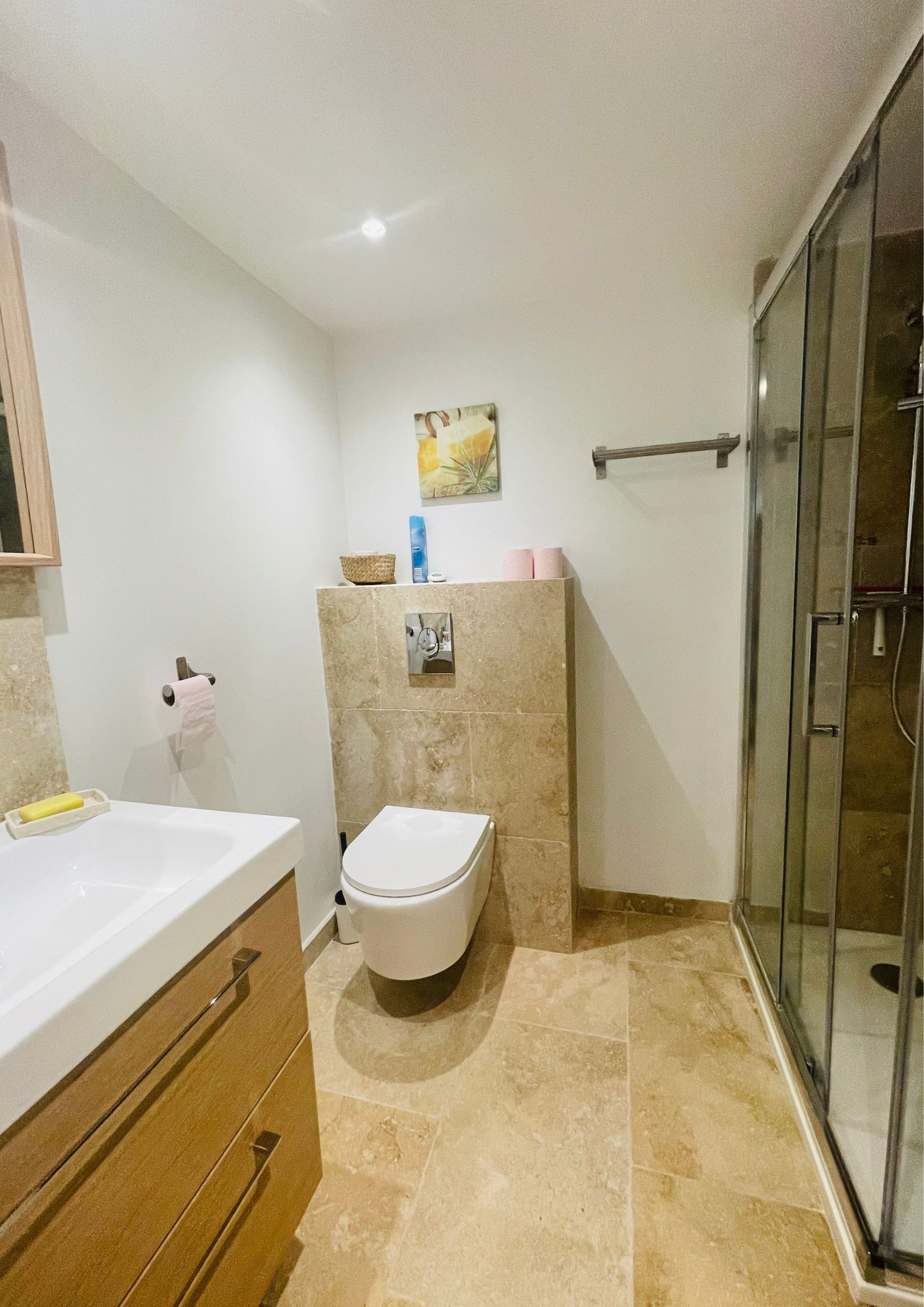 Vous disposerez également d'une magnifique salle d'eau avec travertin naturel, douche à l'italienne avec cabine et WC.