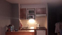 * une pièce principale séjour cuisine avec canapé clic-clac, télévision, réfrigérateur, four,micro-ondes, hotte, plaque électrique 3 feux, cafetière, bouilloire, grille-pain, appareil à raclette, fondue, une table, 5 chaises,