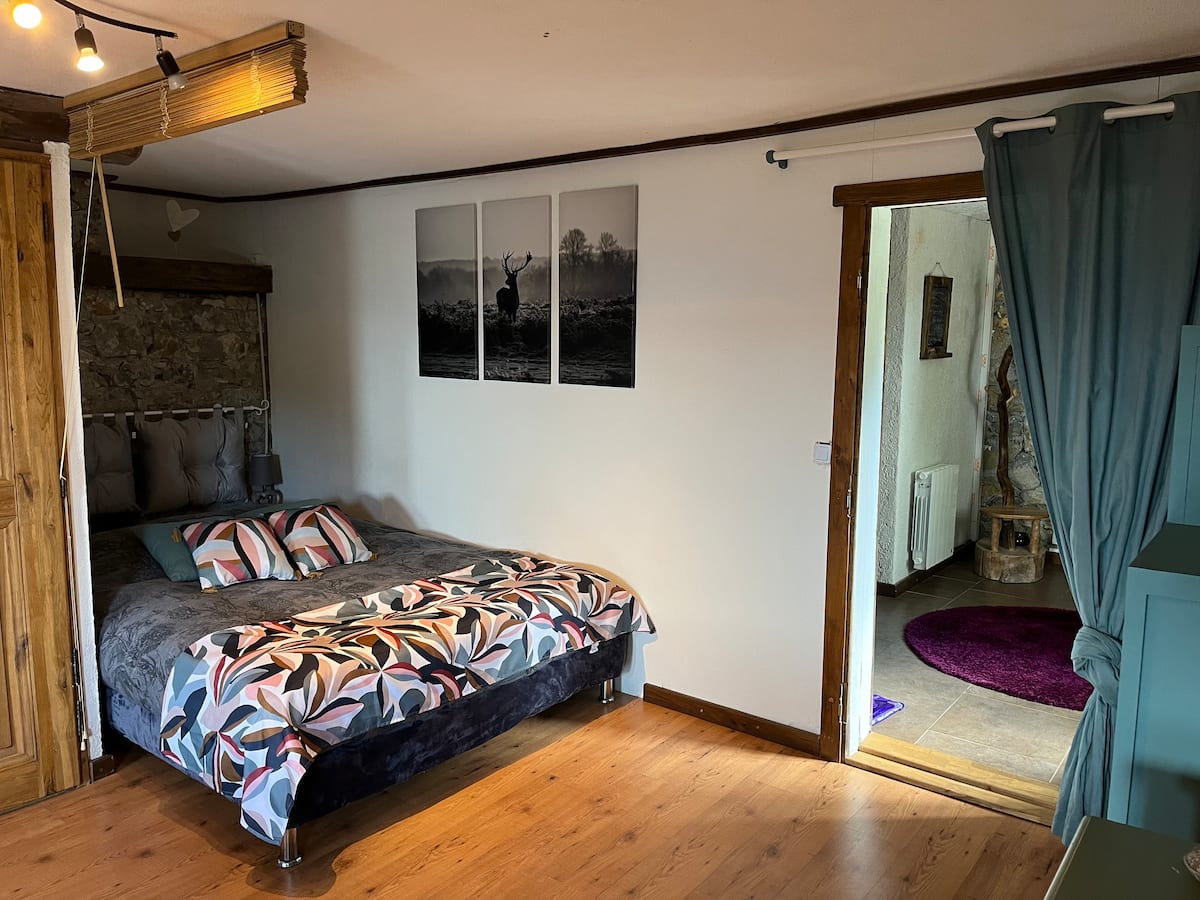 L'atmosphère donnée par la pierre et le poêle à bois en fait un cocon chaleureux, reposant et serein.