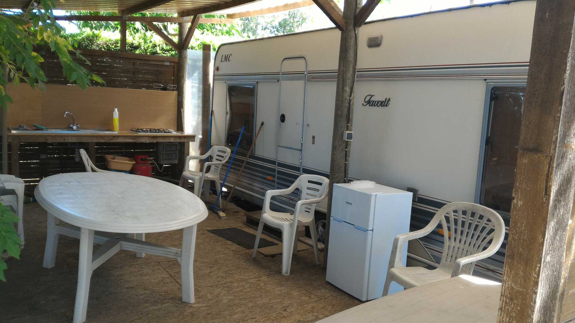 Cette caravane est équipée de grande terrasse avec cuisine extérieure,