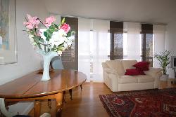 Il est composé d une entrée avec une grande penderie, un placard, un guéridon, un bureau avec ordinateur, internet illimité, ADSL, téléphone illimité( local et national). Le spacieux séjour (26m2) est éclairé par une grande baie vitrée, avec une vue dégagée sur un jardin intérieur, les arbres du parc en arrière-plan à 100 mètres, les toits de Paris en toile de fond. Il comprend un canapé en cuir, un canapé convertible double très confortable, une table de séjour Louis Philippe authentique, une commode Louis XVI d époque, un fauteuil Voltaire, un téléviseur avec DVD et TNT, deux fauteuils et deux chaises de style Louis XVI.