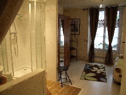 Salle de bains (douche, lavabo, toilettes) donnant sur une chambre pour 2 personnes (lit "BZ" de 140)