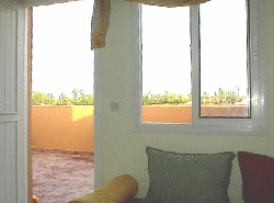 Nous proposons à la location un joli appartement marocain climatisé avec trois pièces (75m²) dont 25 m² d'une très agréable terrasse avec vue donnant sur la palmeraie et les cimes de l'Atlas, très reposante, sans vis-à-vis. L'appartement est équipé,climatisé décoré à la façon berbère ; vous trouverez deux chambres : la chambre de couple, et l'autre avec deux lits . Il y a bien sûr une télé, une salle d'eau avec douche, et des toilettes séparées (à noter les draps et linges fournis). Quant à la cuisine, elle a tous les équipements de base nécessaires . L'appartement se situe en bordure de la palmeraie et face aux cimes de l'Atlas, à deux pas de la medina il est proche des trois golfs et à proximité de toutes les infrastructures de la ville (quartier zouhour ), dont un supermarché moderne à 4-5 mn à pied. Il peut y avoir un service femme de ménage en option (peut préparer des repas aussi).