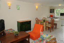 Le salon /salle à manger est équipée de la télé ,la terrasse donne directement sur le jardin et la piscine du complexe.
