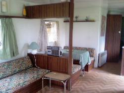 Descriptif : a l'intérieur : un séjour télé, une cuisine,une chambre avec un grand lit, une chambre avec deux lits d'une personne, une salle d'eau, wc.
