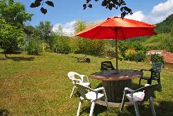 Maison ancienne de 75 m2 sur 3 niveaux (parquets, pierres et poutres apparentes), terrasse et jardinet privé avec piscine extérieure privée plus haut dans le jardin de la propriété.