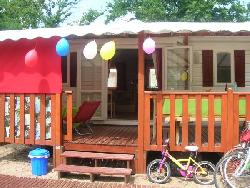 mobil-home sans vis à vis avec terrasse couverte de 12 m2, 4 transats, 1 grand parasol, 2 vélos adulte à disposition et une cage pour 2 cochons dinde ou 1 lapin.