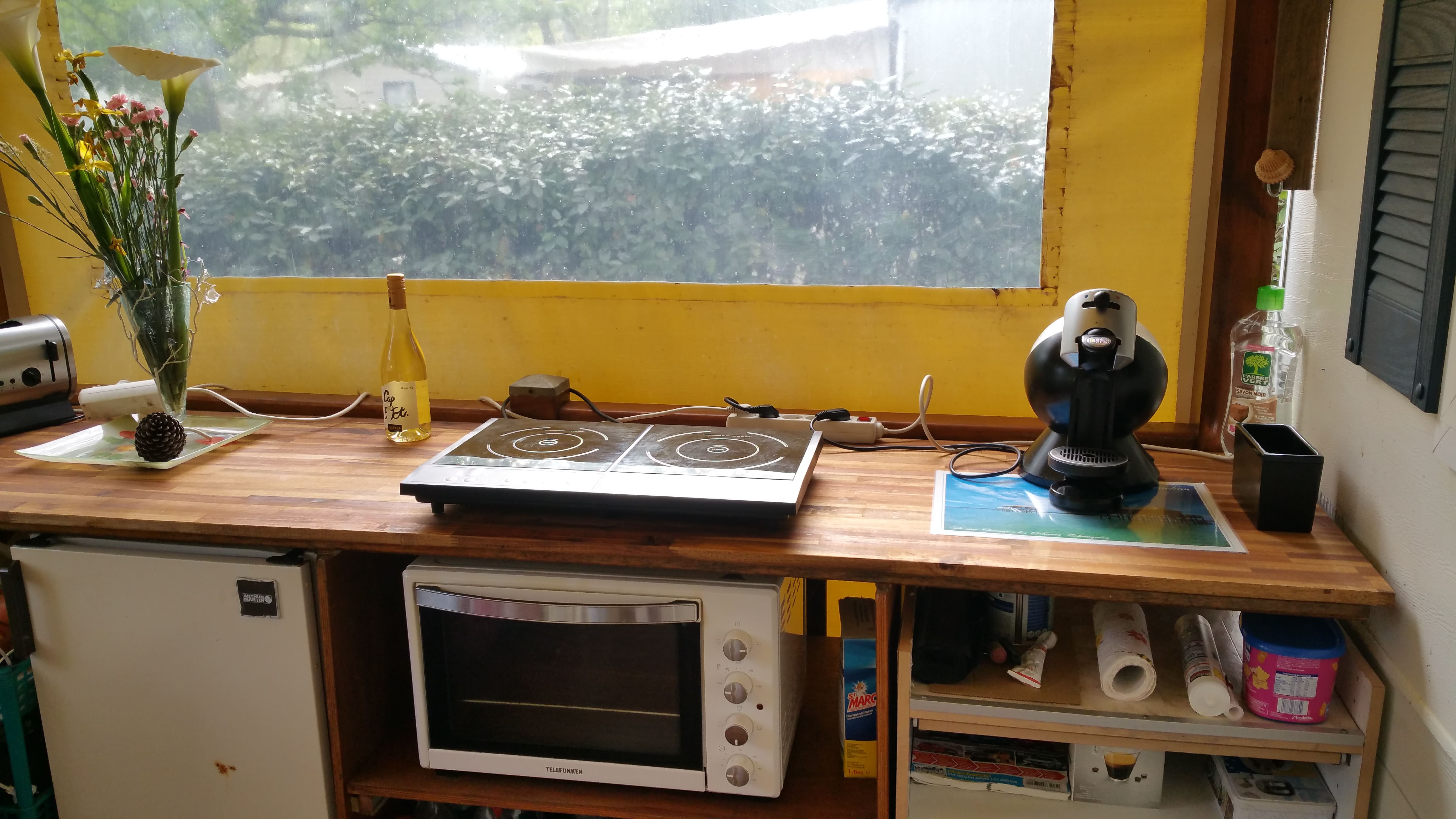 Cuisine extérieure sur une grande terrasse de 20m2 : Table de cuisson 2 feux à induction, frigo, four de 45l (un bon poulet y contient facilement), cafetière Tassimo ou classique, barbecue et plancha électriques.