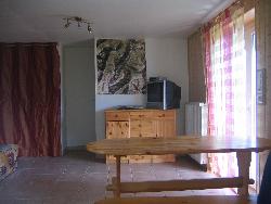 Coin cuisine, pièce principale donnant sur terrasse, BZ en 140 et une chambre avec lits superposés, salle de bain et toilette.