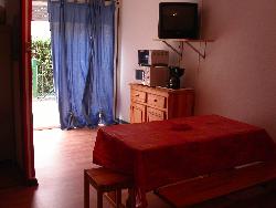 tout équipé. 3 pièces : coin cuisine et salon avec convertible 2 personnes, salle de bain douche et wc, une chambre avec 2 lits superposés.