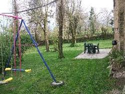 Jardin cloturé 200 m2 avec portique enfant, salon de jardin, barbecue.