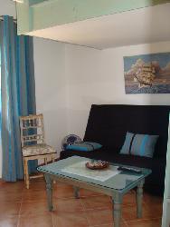 -salon avec canapé convertible 2 personnes, table basse, télévision écran plat. Au dessus mezzanine avec lit en 140.