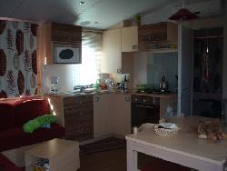 Il est tout confort : 2 chambres + banquette convertible 2 places dans le salon (oreillers et couettes fournis pour 6 pers max, pas les draps qui sont en options), salle de bain et WC séparés.