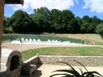 Le rez-de-chaussée de la grange est de plein pied avec la cour intérieure castinée ou se trouve les salons de jardin et le barbecue. L’étage est au même niveau que la piscine.