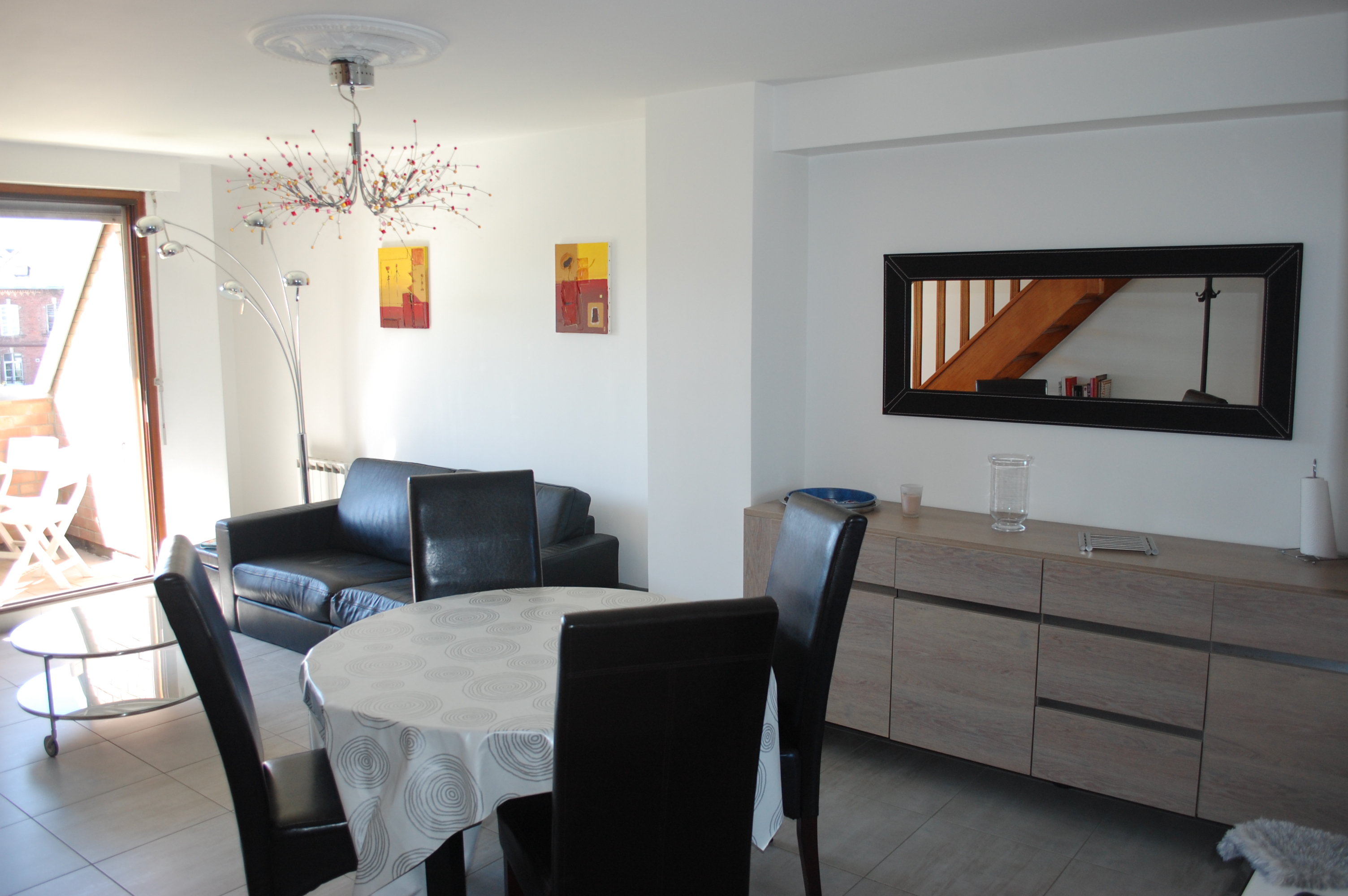 Comprenant salon, terrasse, cuisine, salle de bain (douche) /WC et 2 chambres en duplex. Loué meublé tout confort : Cuisine équipée: plaque vitrocéramique, four, frigo/congélateur, micro-onde, lave vaisselle, lave linge, bouilloire, vaisselle,... Salon : table, chaises, meuble bahut, canapé, table basse, TV, table et chaises de terrasse, 2 Chambres : 2 lits (140 cm) avec couettes, couvertures et oreillers, table de chevet, armoire-penderie.