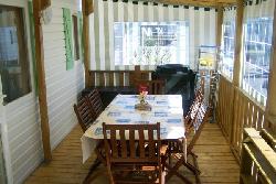 Terrasse avec portillon de sécurité (enfants et/ou animaux), meuble à chaussures, salon de jardin, bain de soleil, barbecue, etc.