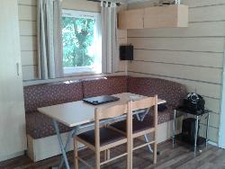 1chambres1 lit 140cm, 1 chambre 2 lit de 80cm ,salon central 2 couchages, climatisation, grande baie vitrée dans la cuisine et dans le salon avec accès directe a la terrasse , wc , salle de bain , équipé d'une cafetière électrique , grille pain , d'un four micro onde mixte , une bouilloire électrique, plancha électrique, , tv écran plat 60 cm connexion usb, chaine stéréo samsung 35 watts connexion clef usb, 1 aspirateur, 1 salon de jardin (1 table + 4 chaises pliantes + 2 fauteuils), 2 bains de soleil et petite table, 1 place pour voiture. Pas de fumeur a l’intérieur et animaux non autorisés... A l'intérieur du Camping, Le Silo (restaurant) vous accueuille pour le déjeuner et le diner. le camping est proche de tous commerces et a 2,8 km de la plage.