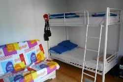 Ce studio en RDC est prévu pour 4 personnes( un canapé lit de type clic clac et 2 lits superposés ) , idéalement 2 adultes /2 enfants .salle de bain et wc séparés.