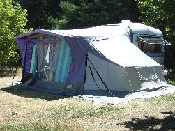 Loue petite caravane avec grand auvent (coin cuisine et coin chambre) à 5 minutes du lac de Serre-Ponçon.