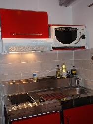 Pièce séparée avec coin cuisine, réfrigérateur-congélateur, plaque vitrocéramique 2 feux, lave-linge, desserte, aspirateur, table et fer à repasser