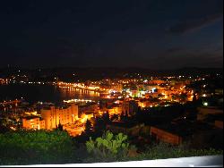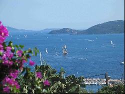 Vue panoramique exceptionnelle surplombant la mer : le port du Lavandou et de bormes, la Baie du lavandou, les iles d'or, le cap Bénat, ainsi que la ville du Lavandou.