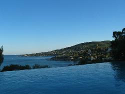 Le séjour avec TV, DVD, cheminée de feu de bois s'ouvre par une porte vitrée sur grande terrasse au sud partiellement couverte, la vue sur la mer et sur la piscine à débordement est exceptionnelle, sans vis à vis.