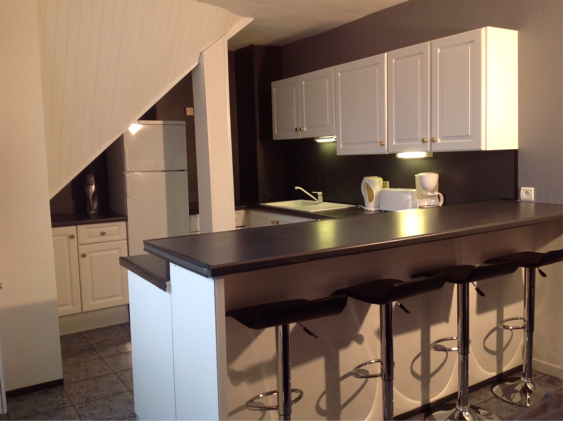 Cuisine américaine : vaisselle, ustensiles et batterie de cuisine, lave vaisselle, réfrigérateur/congélateur, plaque vitro céramique 4 feux, bouilloire, four multifonctions, cafetière, grille pain.. Aspirateur. Table et chaises