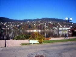 Jolie vue bien dégagée: lac, ville, campagne et montagne.